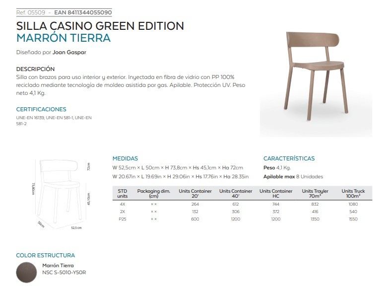 Silla con brazos Casino de Resol, fabricada con estructura inyectada de fibra de vidrio. Apilable.