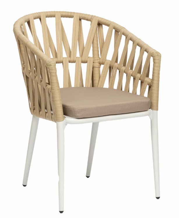 Silla con brazos Cerdeña fabricada en aluminio blanco y cuerda en color crema.