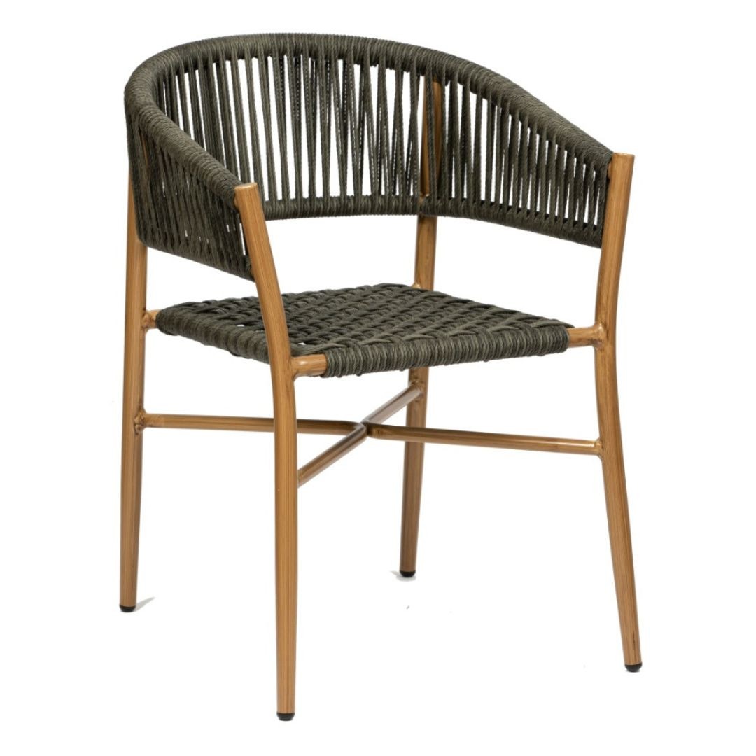 Silla con brazos Havana fabricada en aluminio deco roble natural y cuerda en color gris.