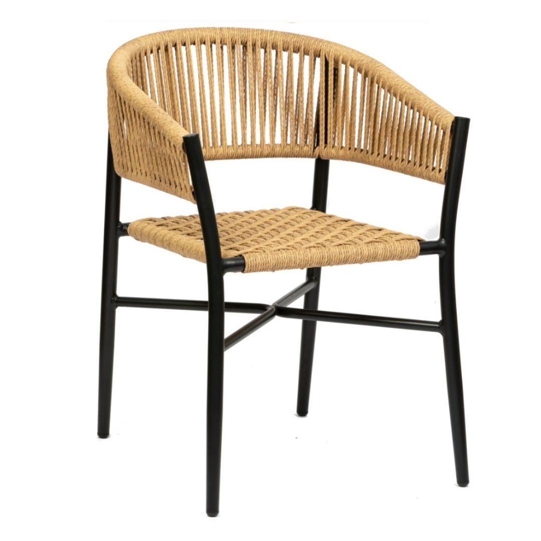 Silla con brazos Havana fabricada en aluminio negro y cuerda en color crema.
