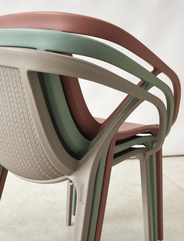 Silla con brazos modelo Hop de Ezpeleta en polipropileno reforzado con fibra de vidrio.