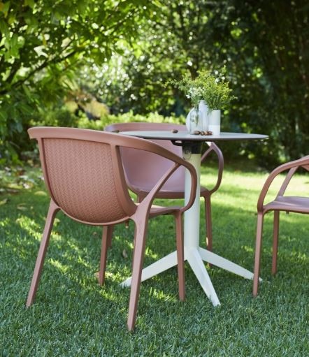 Silla con brazos apilable para uso exterior e interior.