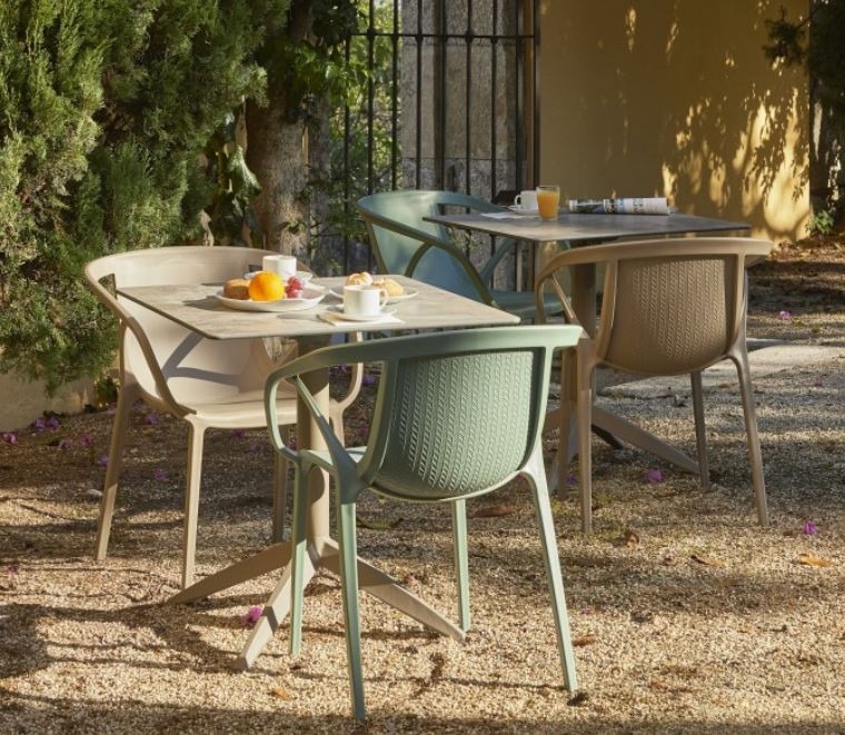 La silla modelo Hop de Ezpeleta, con líneas atemporales y geometría envolvente, es ideal para terrazas de bar, restaurante y cafetería que busquen aprovechar el espacio al máximo ya que se puede apilar.