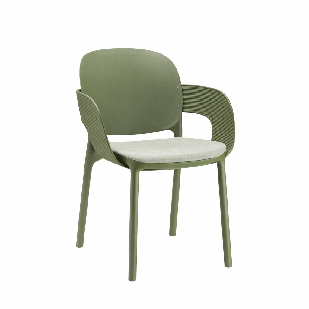 Silla con brazos Hug fabricada con estructura monocasco en tecnopolímero y tejido acrílico.