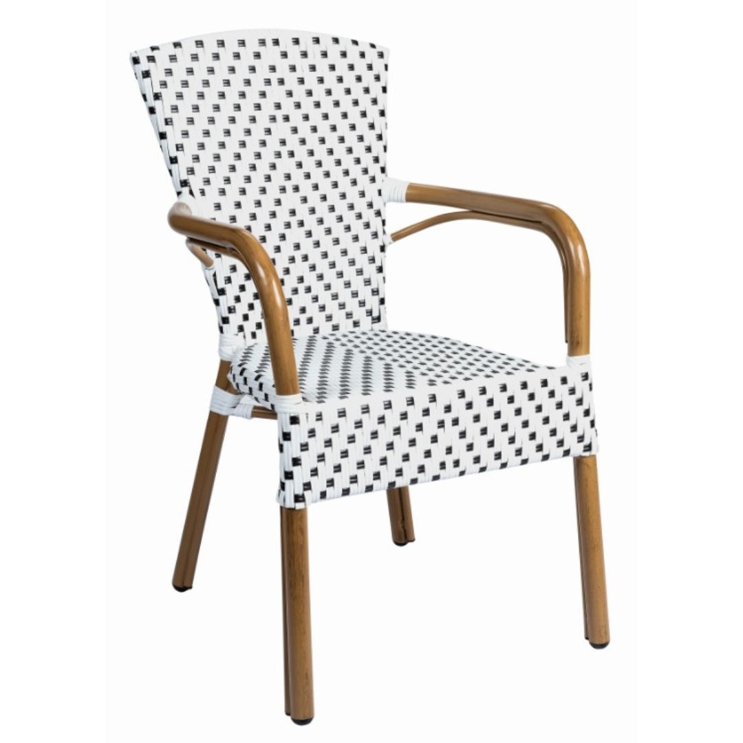 Silla con brazos Jamaica fabricada con estructura de aluminio pintado y rattán sintético trenzado.