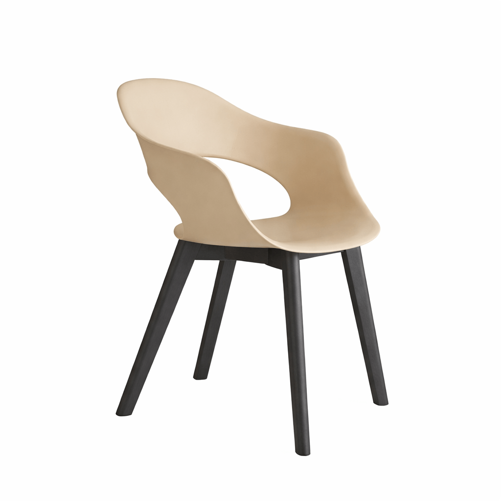 Silla con brazos Lady fabricada con asiento y respaldo en tecnopolímero y patas en madera de haya pintadas en negro.