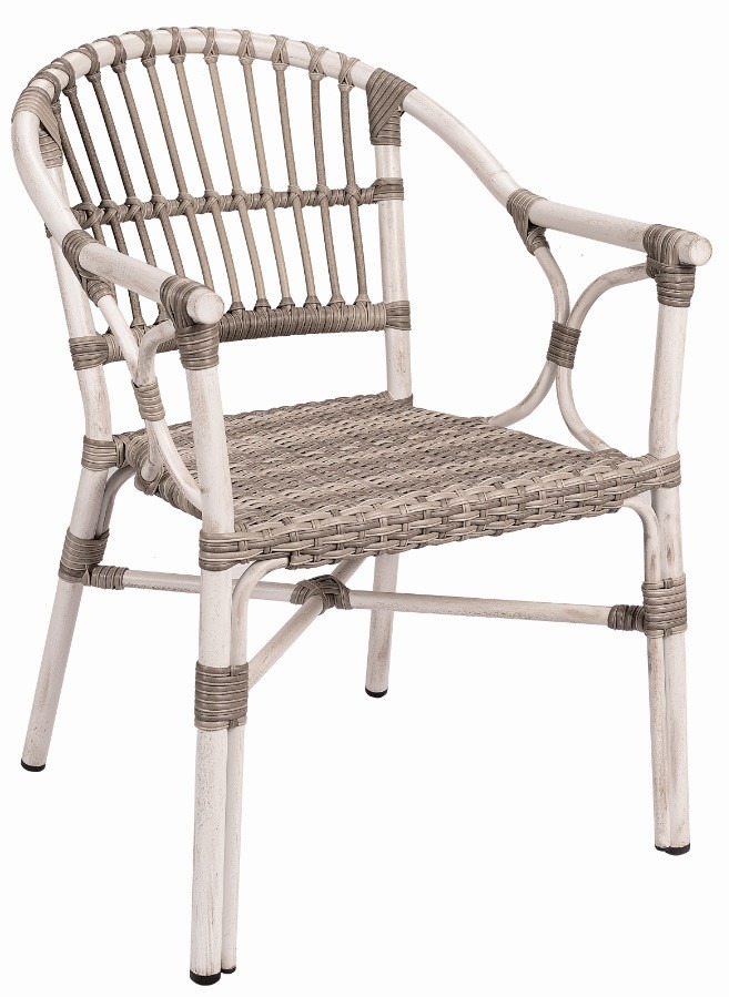 Silla con brazos Martinica fabricada en aluminio blanco y trenzado gris.