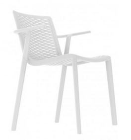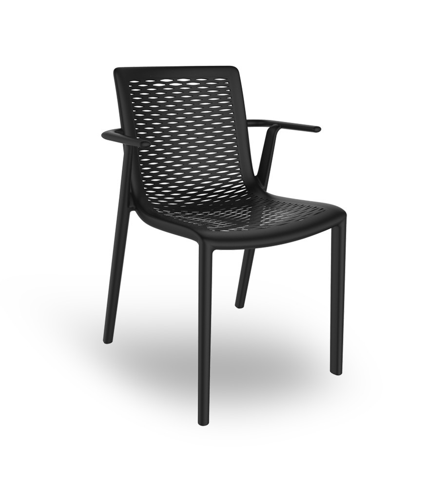 Silla con brazos Netkat de Resol, fabricada con estructura inyectada en fibra de vidrio y apilable.