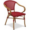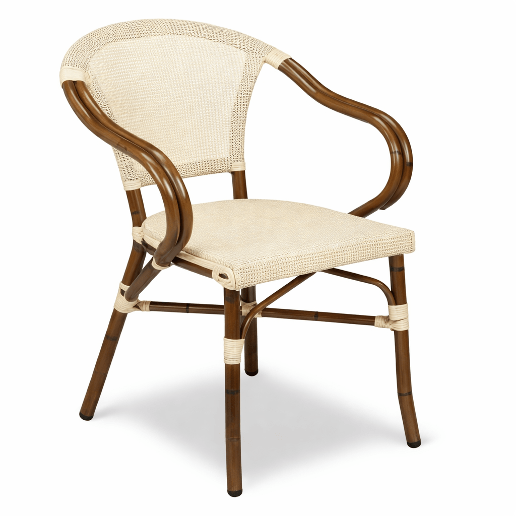 Silla con brazos Odal fabricada en aluminio plastificado imitación caña y textilene color crema. De uso interior  y exterior.