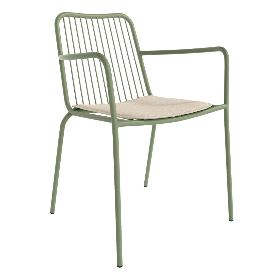 Silla Ohana en color verde tiza, con estructura metálica y cojín.