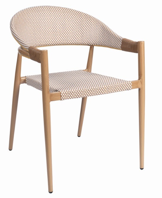 Silla con brazos Osaka fabricada en aluminio deco roble natural y textilene color latte.