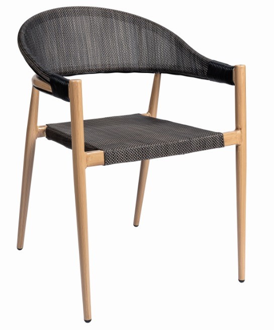 Silla con brazos Osaka fabricada con estructura aluminio pintado deco roble natural y textilene color negro. De uso interior y exterior.