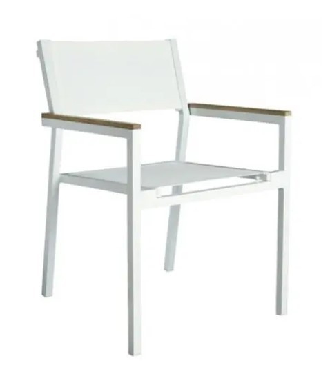 La silla Shio con brazo de Resol en aluminio pintado blanco, asiento y respaldo en textiline blanco y con embellecedor de madera en los apoyabrazos.