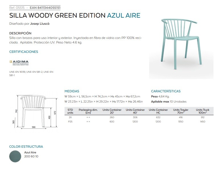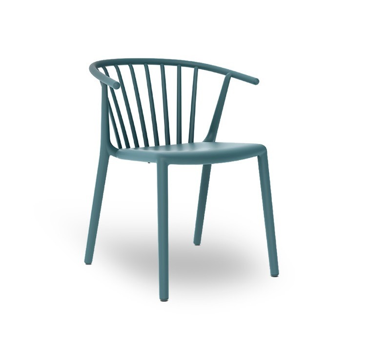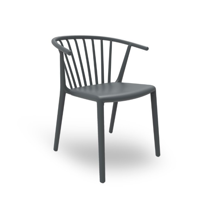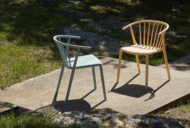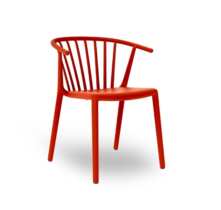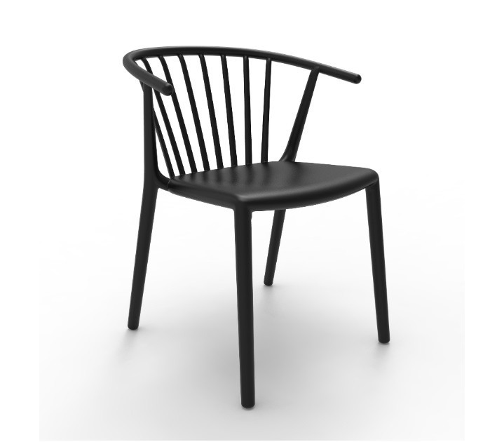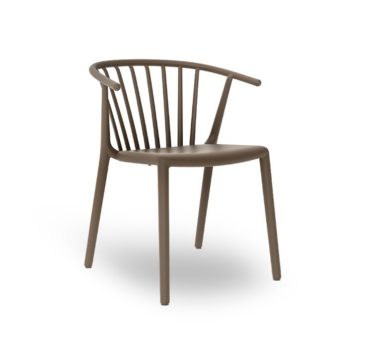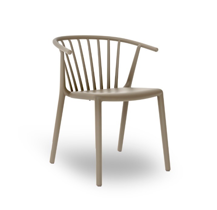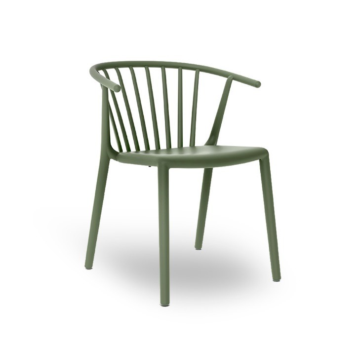 Silla con brazos Woody de Resol, fabricada con estructura inyectada en fibra de vidrio. Apilable.
