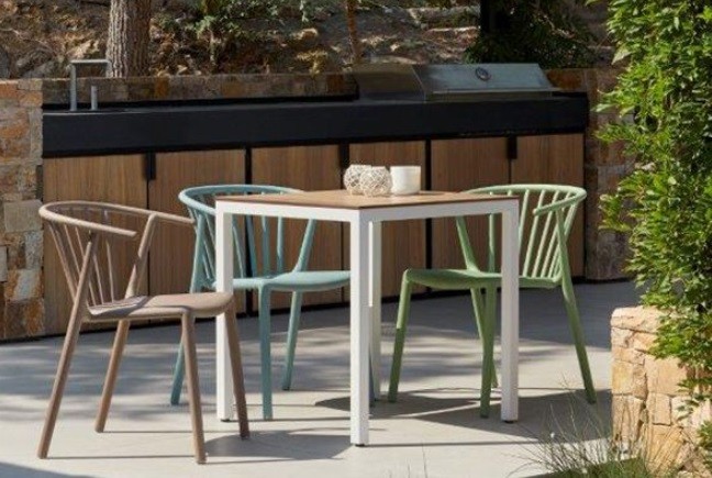 La silla con brazos Woody de Resol, fabricada en inyección de fibra de vidrio, es ideal para zonas de piscina en hoteles, campings y apartamentos turísticos.
