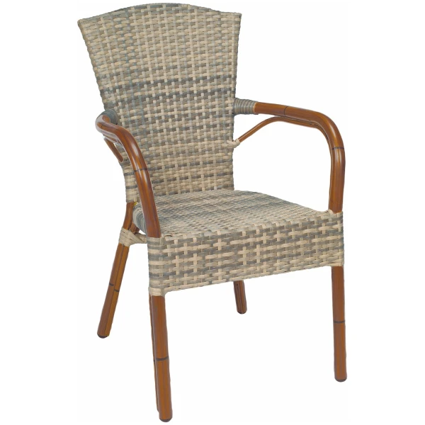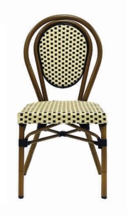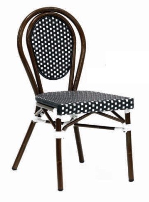 La silla Dijon está fabricada con la estructura en aluminio y asiento y respaldo en rattan sintético. Resulta un modelo de silla inspirada en los bistrot de Francia, por lo que queda ideal en bares y restaurantes que quieran dar un aire parisino.