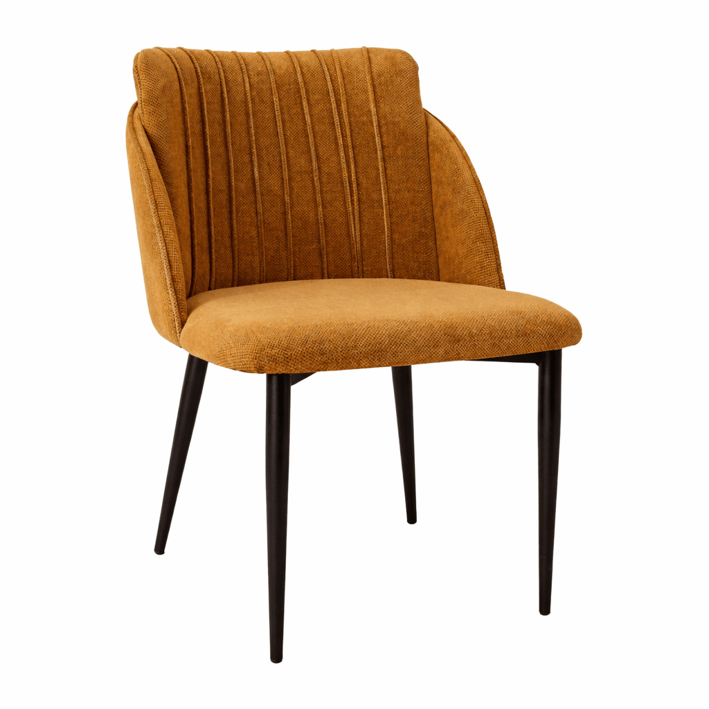 Silla Flam tapizada 100% en poliéster en mostaza y patas cónicas en acero negro.