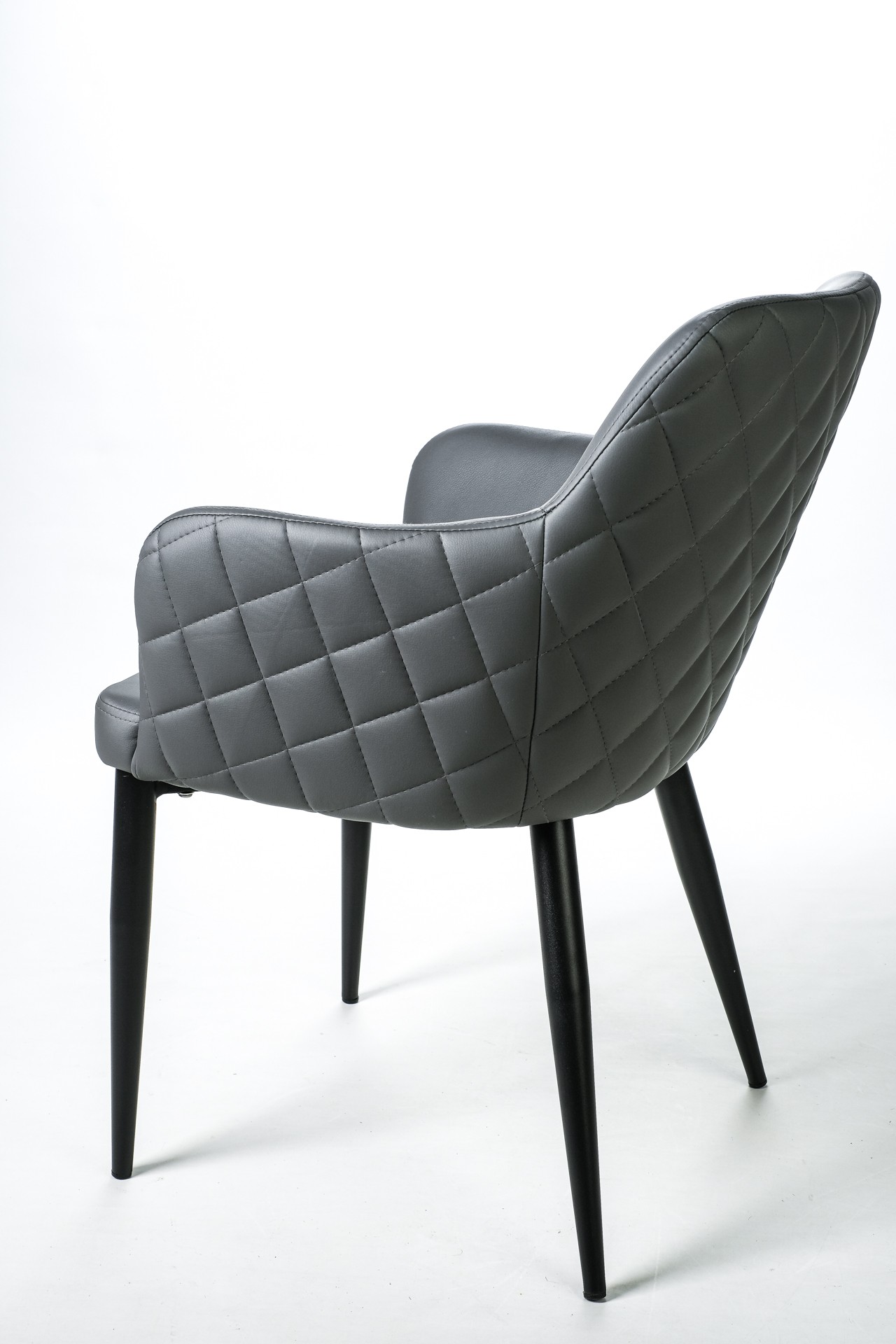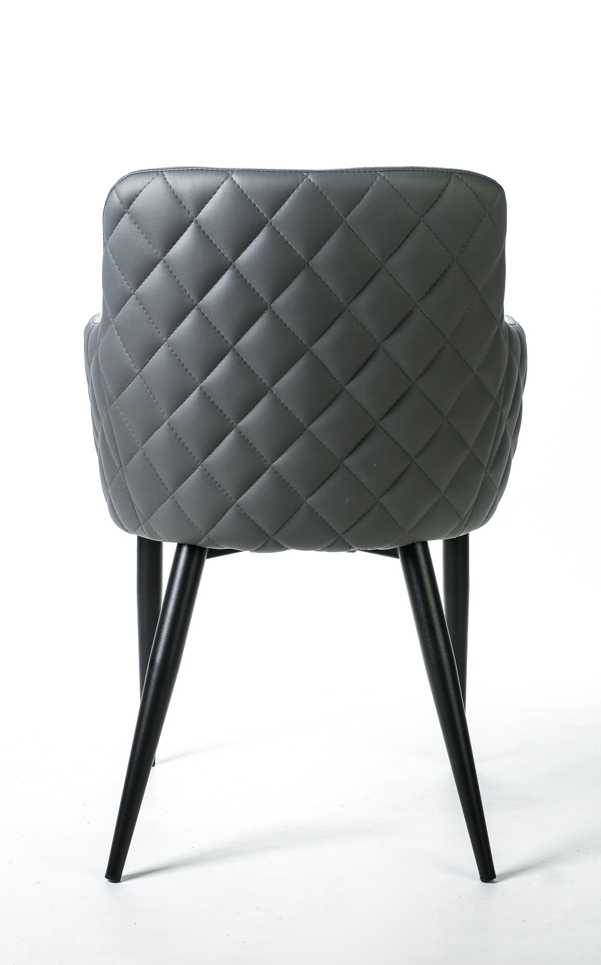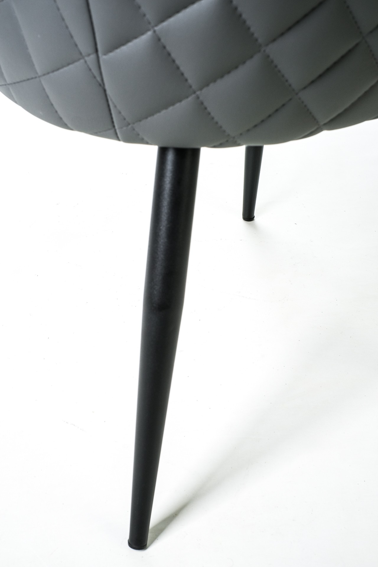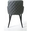 Silla fabricada asiento y respaldo en símil piel gris y patas metálicas negras.