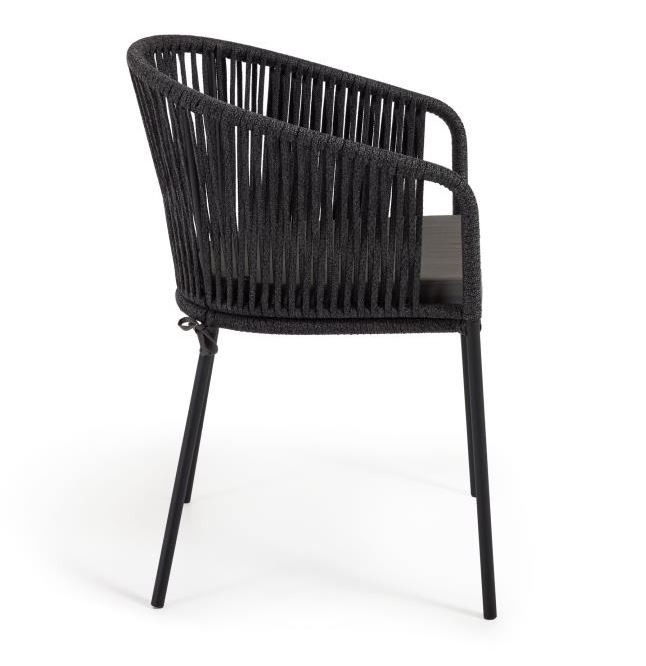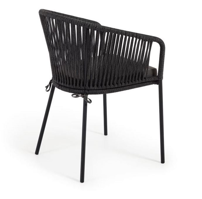 La silla en cuerda trenzada a mano, en color negro y patas en acero galvanizado, uso en todo tipo de estancias, creando un ambiente desenfadado.