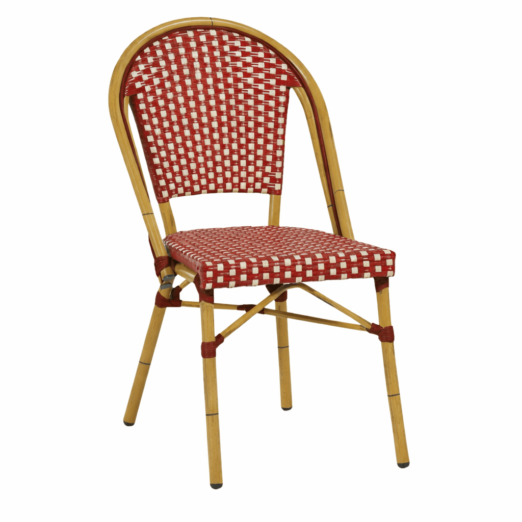 La silla M1201G fabricada con armazón de aluminio plastificado y médula sintética 100% virgen en dos colores granete y crema con un estilo que imita a los bares de París, es ideal para espacios interiores y exteriores, es muy usada en bares y restaurantes por su confort, diseño y resistencia.