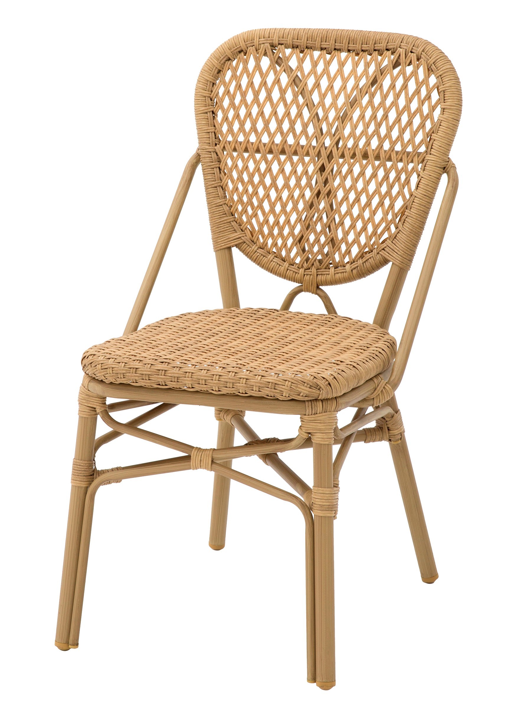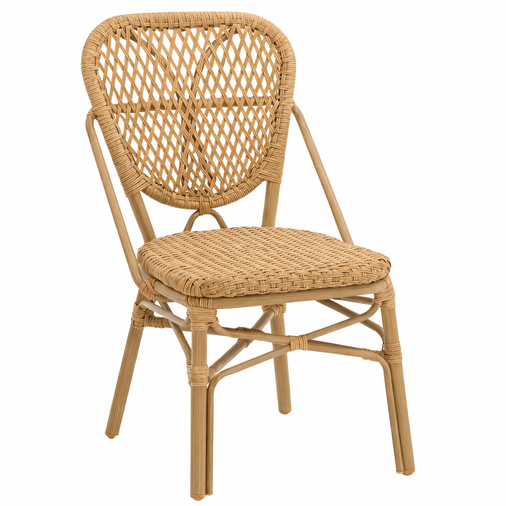 La silla Marlon fabricado con estructura de aluminio color natural, asiento y respaldo en rattan, es ideal para establecimientos que quieran dar un toque natural y elegante.