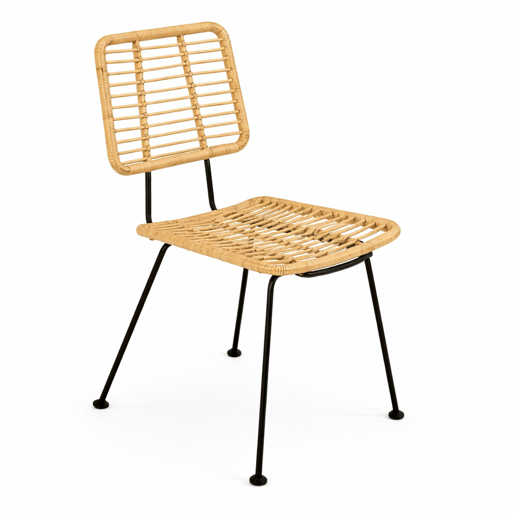 Silla Moon, fabricada con patas metálicas galvanizadas en color negro, con asiento y respaldo en mimbre sintético color natural.