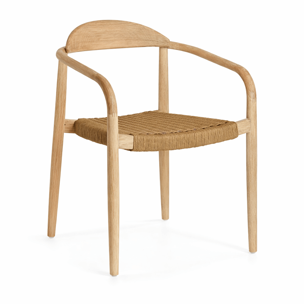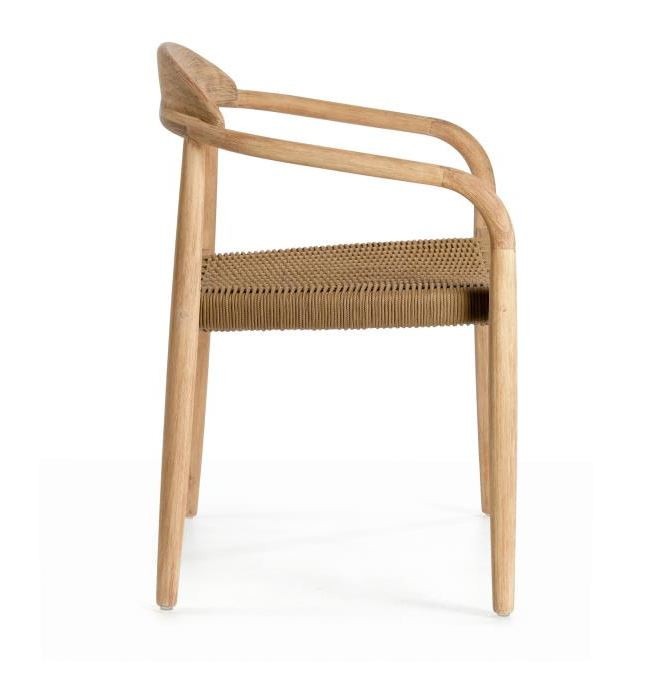La silla NIN esta fabricada con madera maciza de acacia y asiento en cuerda, trabajada a mano, en color beige.