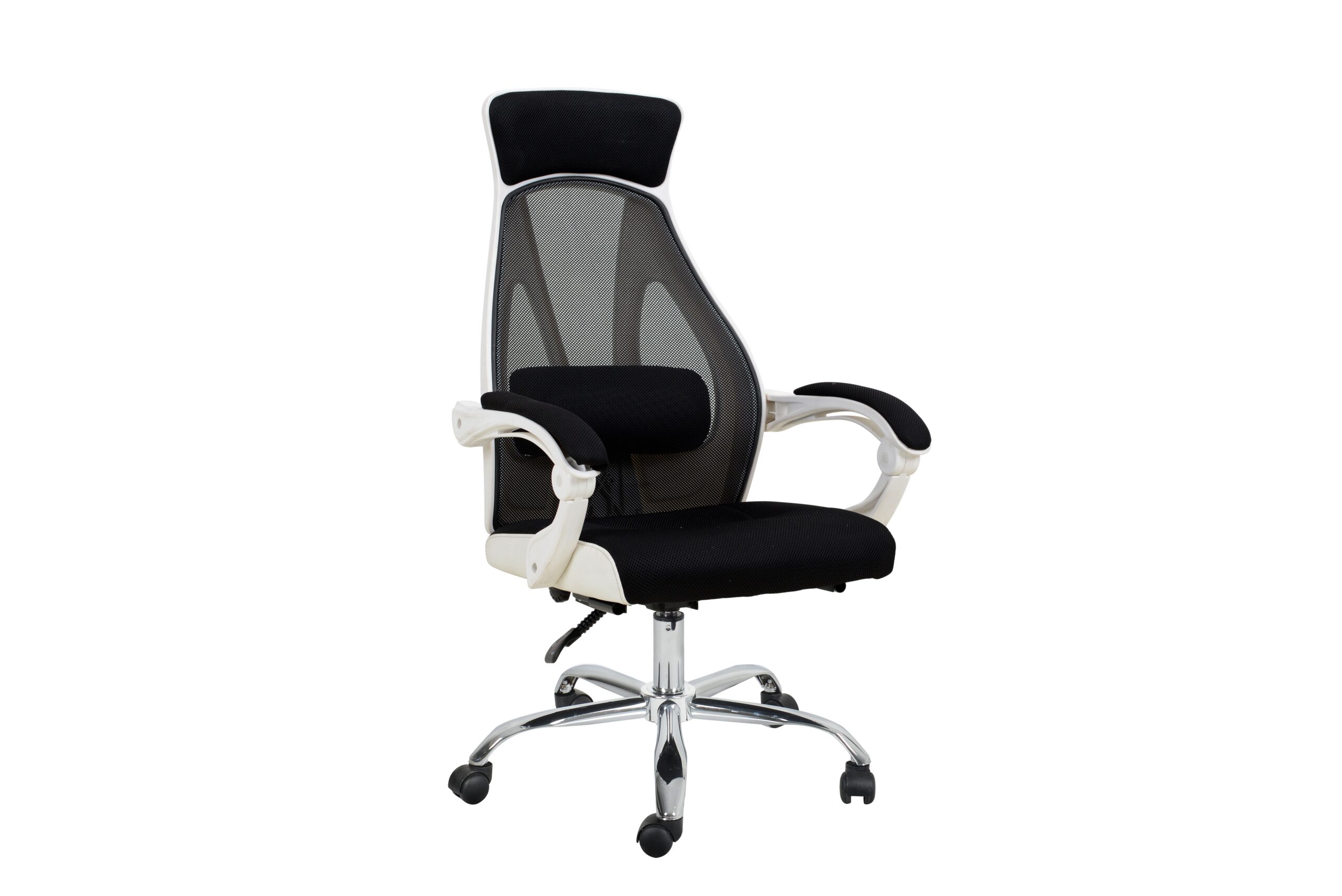 Respaldo y asiento tapizado en tejido técnico negro. La carcasa es color blanco.