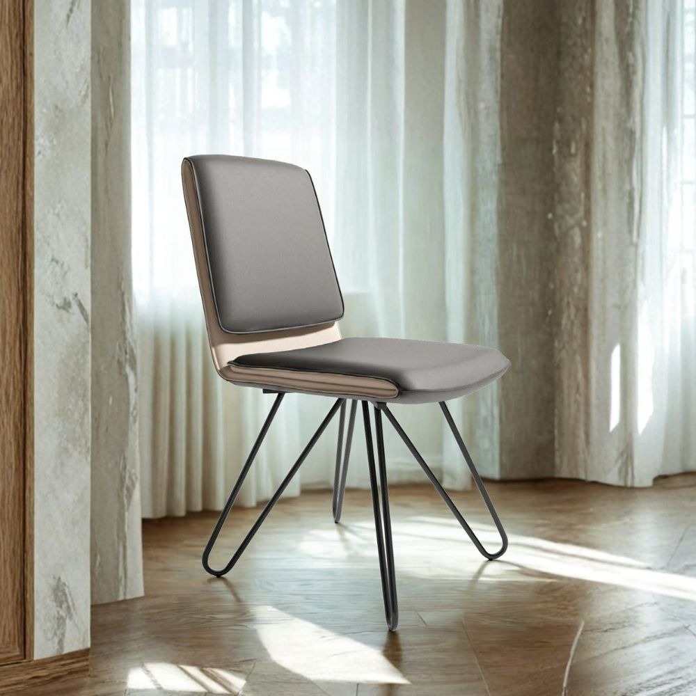 Silla con asiento y respaldo tapizados con combinación de 2 telas. Patas metálicas negras.