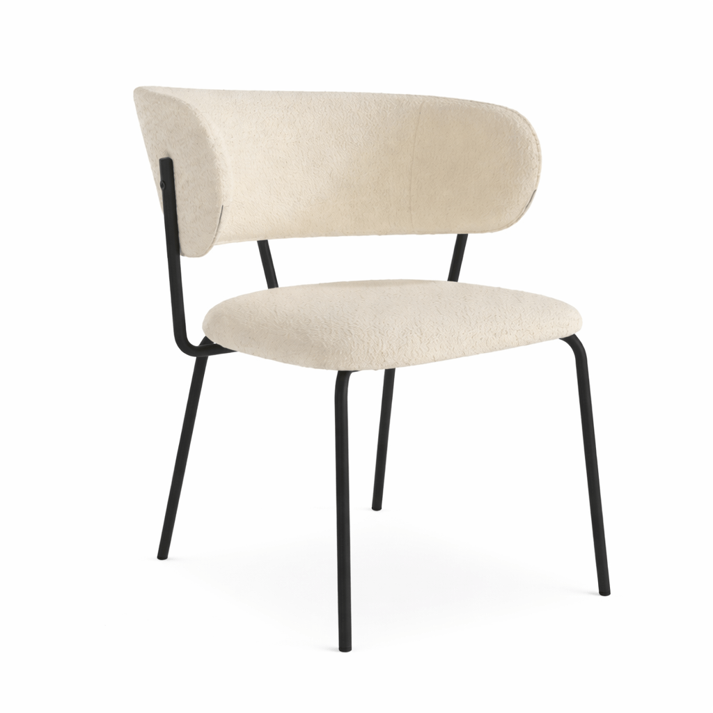 Fabricada con asiento y respaldo tapizados y patas en metal negro.
