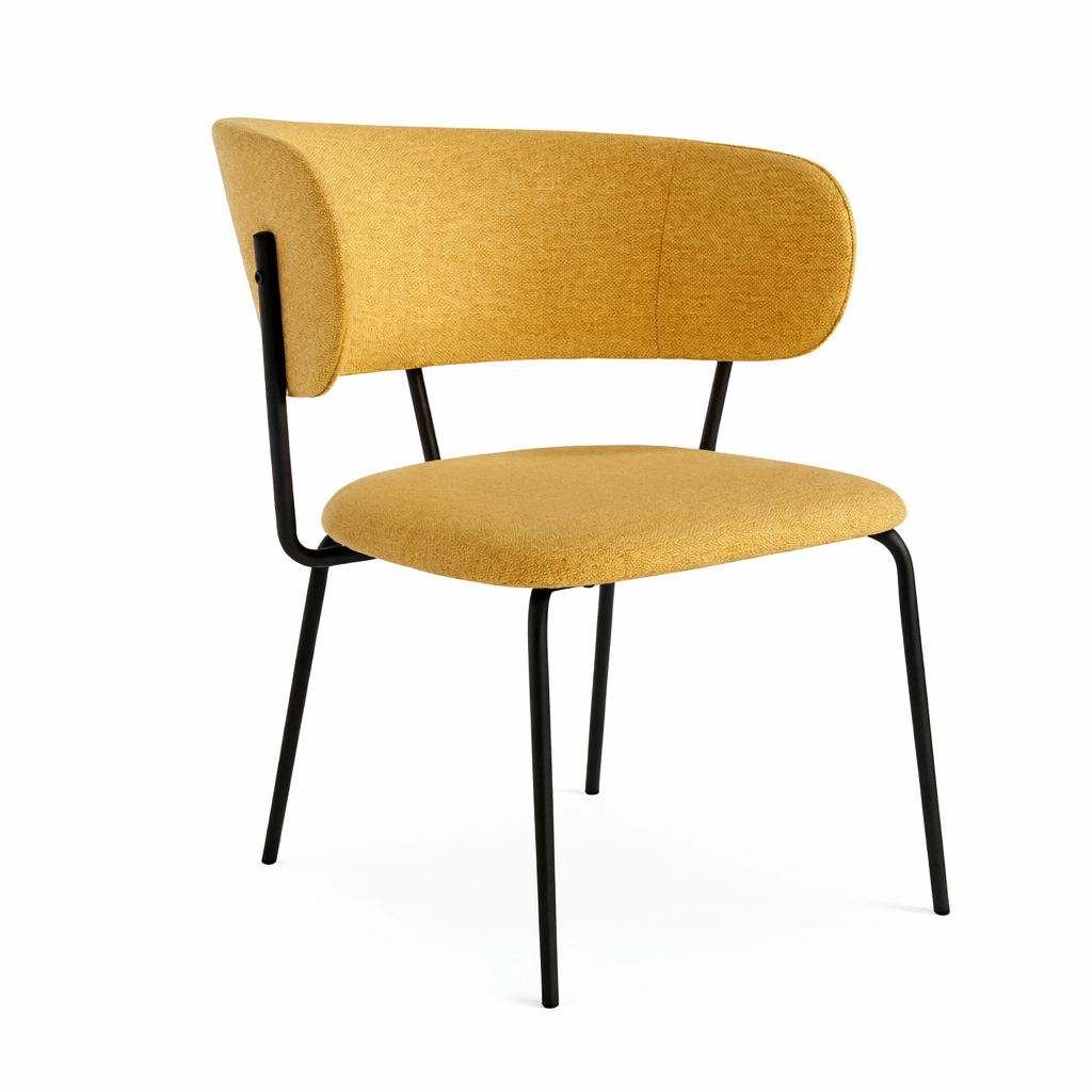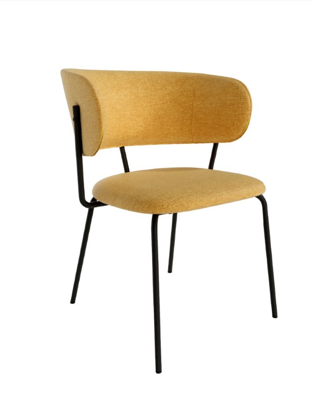 Fabricada con asiento y respaldo tapizados y patas en metal negro.