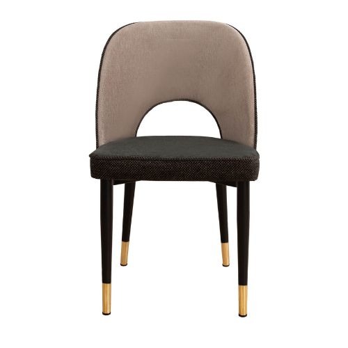 La silla Reine fabricada patas cónicas en acero negro y taco dorado y tejido en poliéster verde y beige, es ideal para restaurantes que quieran dar un toque moderno  e innovador.