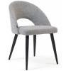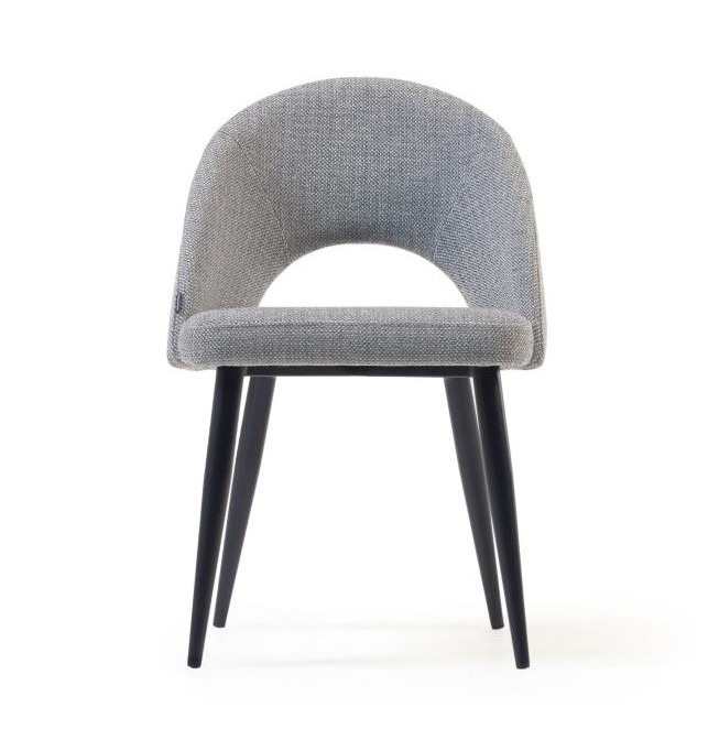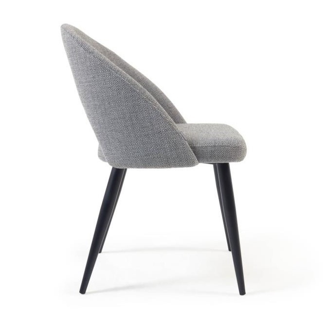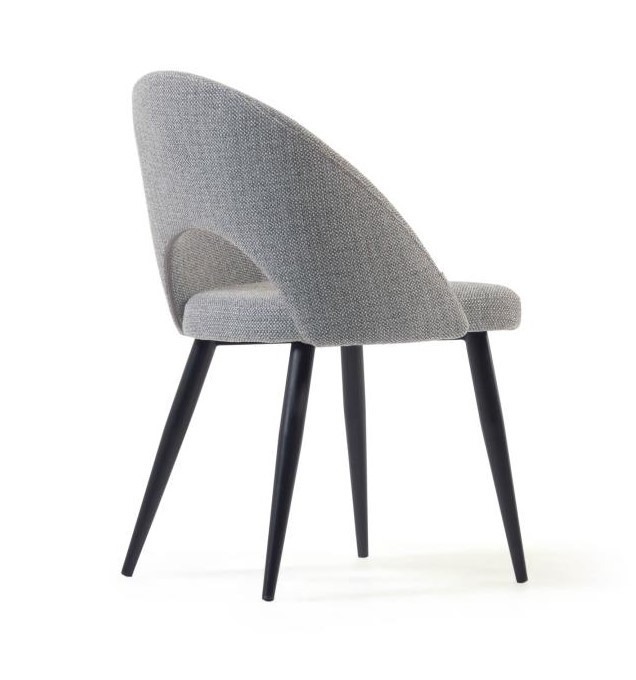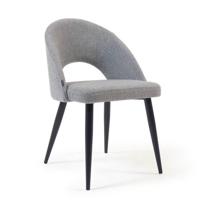 La silla tapizada Mael está tapizada en tejido color gris, y tiene sus patas en acero pintado color negro.