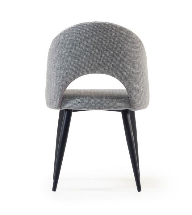 La silla tapizada en tejido color gris, con armazón de tubo acabado negro y es muy usada en bares y restaurantes por su confort, diseño y resistencia.