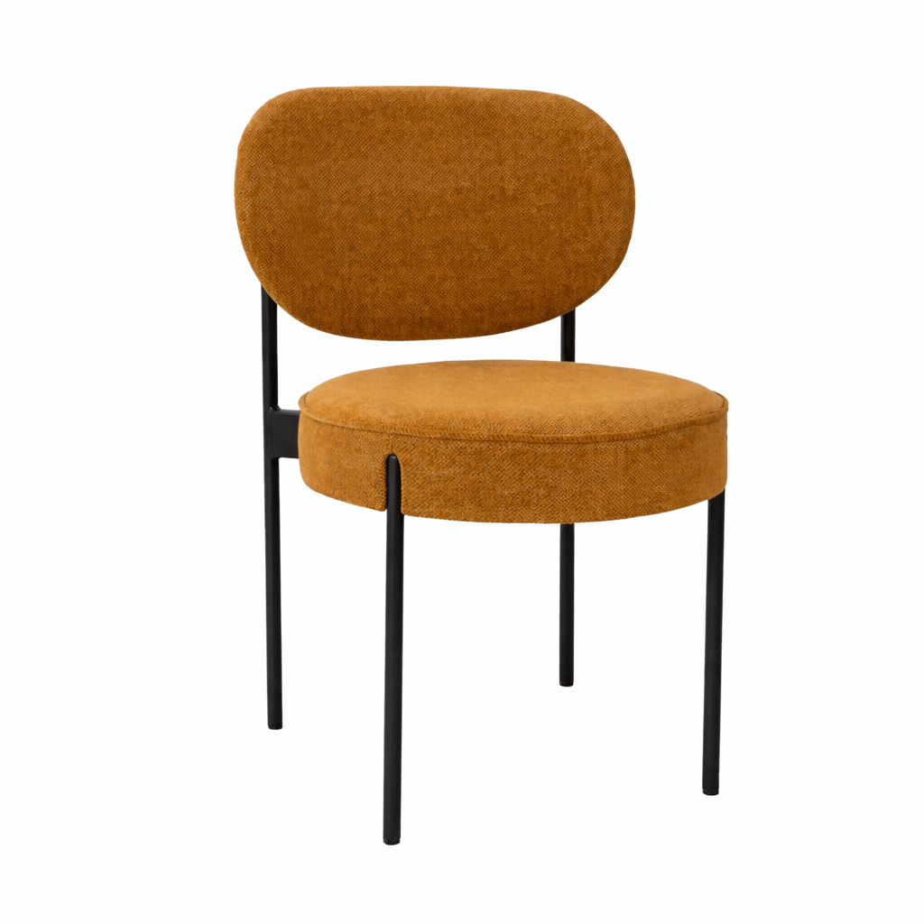 Silla Undreal mostaza tapizada 100% en poliéster, con carcasa curvada fabricada en madera de haya y estructura de acero lacado texturizado negro.