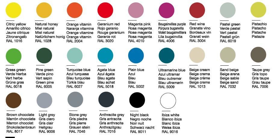 Colores: Amarillo cítrico, verde hierba, naranja vitamina, rojo geranio, púrpura buganvilla, azul turquesa, azul ultramar, gris piedra, granate vino, marrón chocolate, verde pino, gris antracita, negro noche, gris topo, beige arena y blanco ibiza.