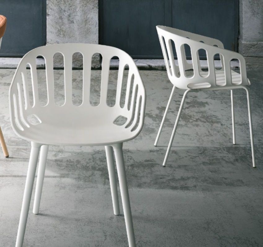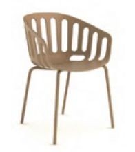 El sillón Ball está fabricado con estructura metálica revestida de tecnopolímero inyectado y patas pintadas.