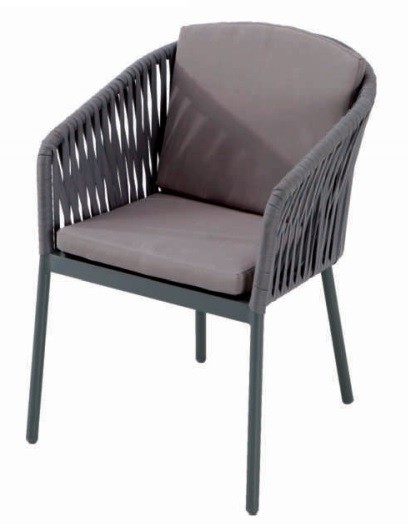 Sillón modelo Guam fabricado estructura de aluminio, asiento y respaldo en cuerda sintética gris y con cojín color gris.