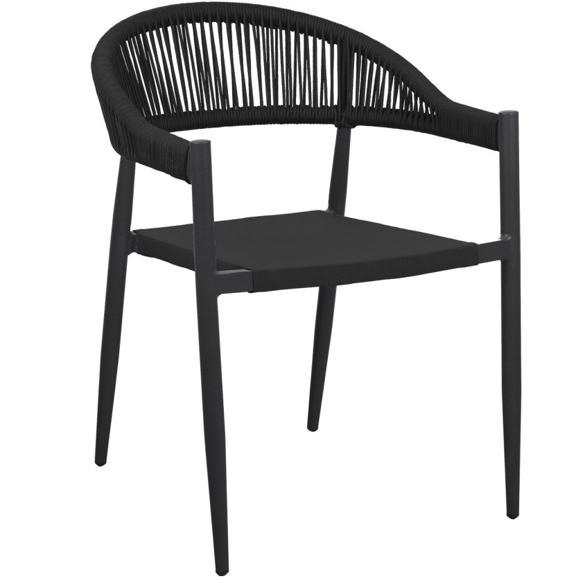 Sillón Liko fabricado en aluminio pintado en color antracita, asiento en textilene negro y respaldo en cuerda.