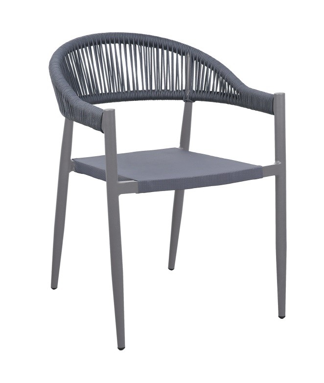 Sillón Liko fabricado en aluminio pintado en color gris, asiento en textilene gris y respaldo en cuerda.