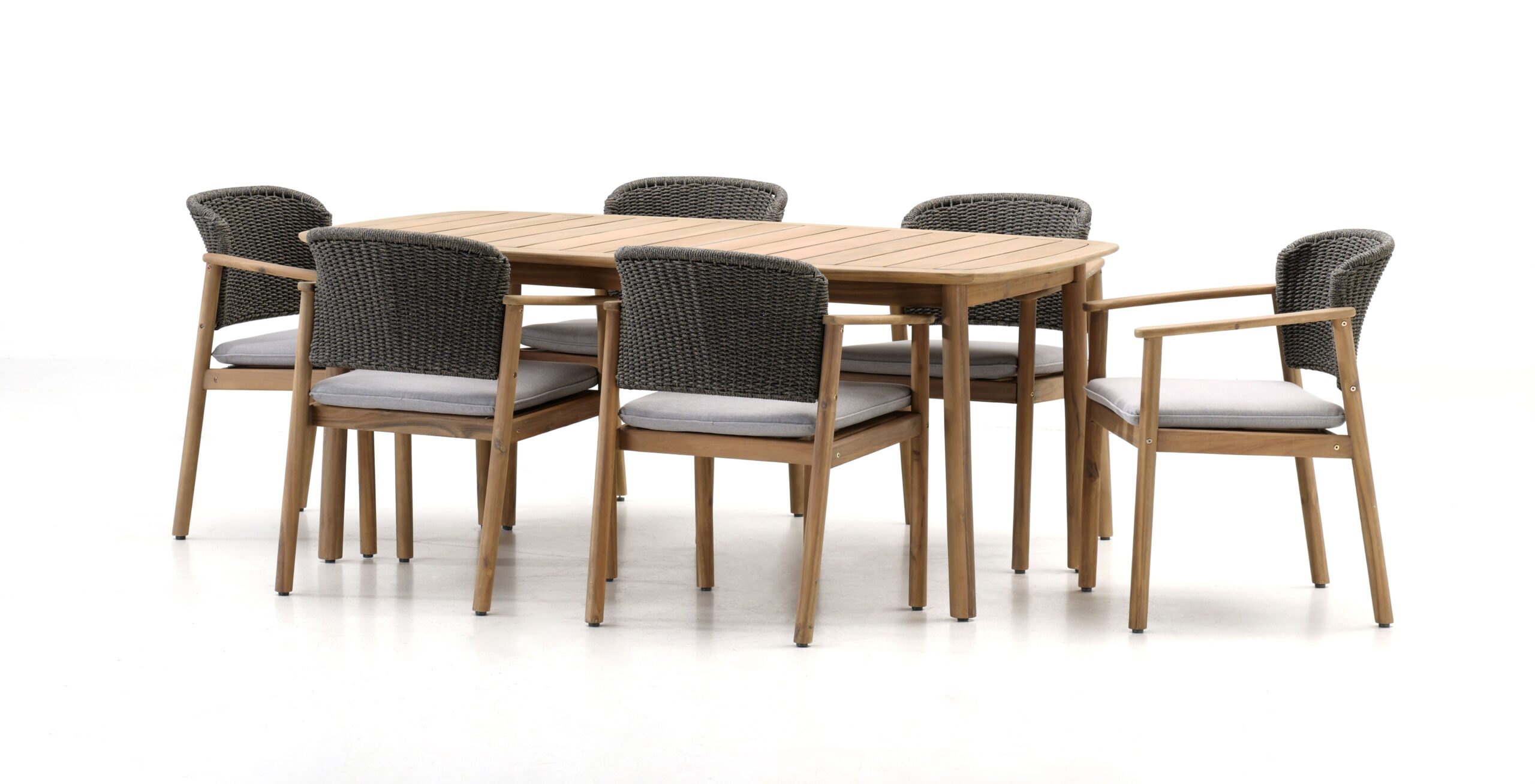 Sillón Logan con estructura de madera y tejido en cuerda color gris.