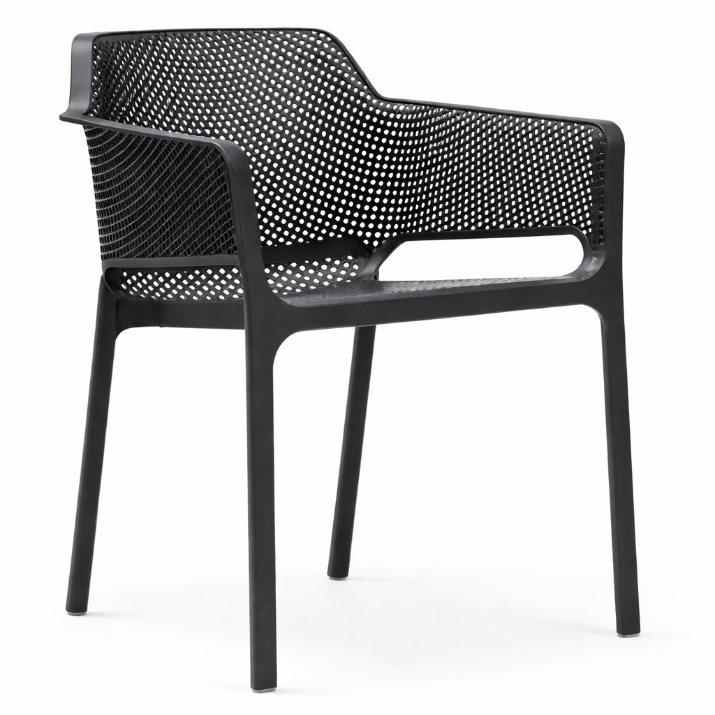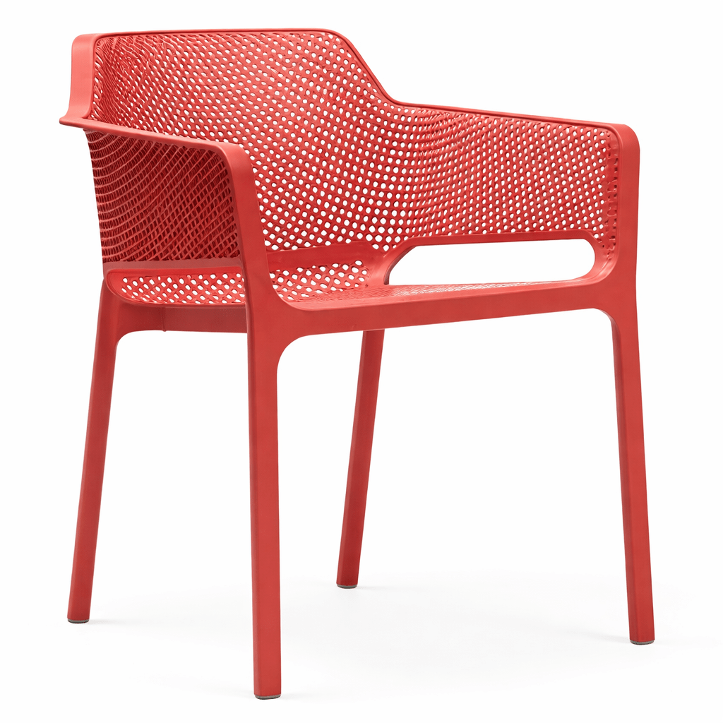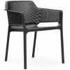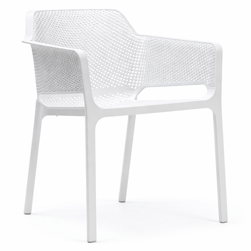 El sillón Net de Nardi es un sillón apilable realizado en polipropileno y fibra de vidrio y lleva tacos antideslizantes en cada una de sus cuatro patas.