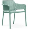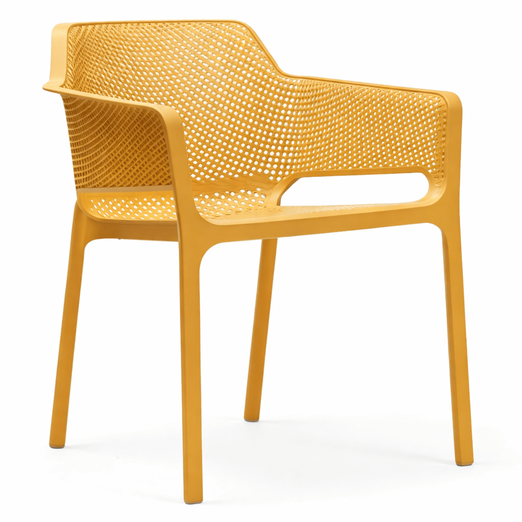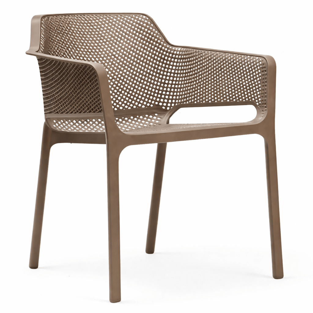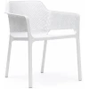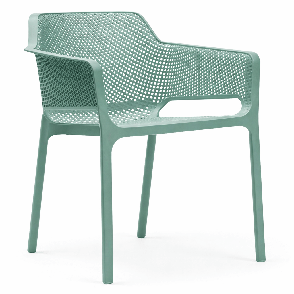 El sillón Net de Nardi es un sillón apilable realizado en polipropileno y fibra de vidrio y lleva tacos antideslizantes en cada una de sus cuatro patas.
