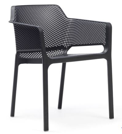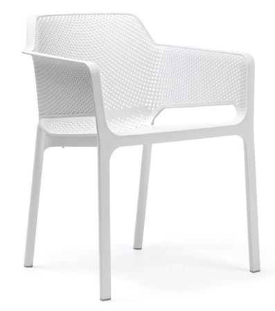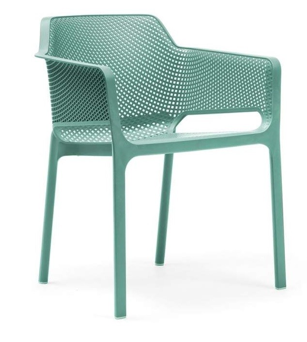 El sillón Net de Nardi es un sillón apilable realizado en polipropileno y fibra de vidrio y lleva tacos antideslizantes en cada una de sus cuatro patas.