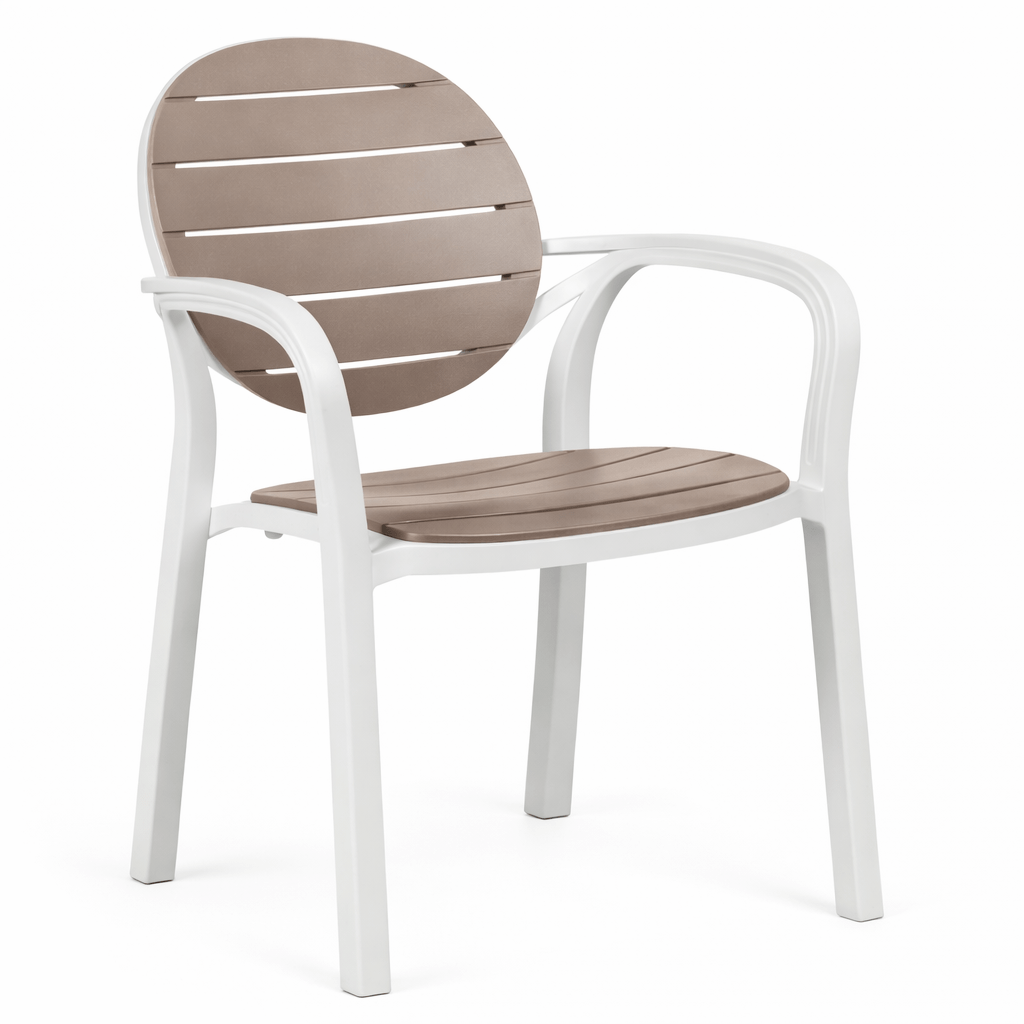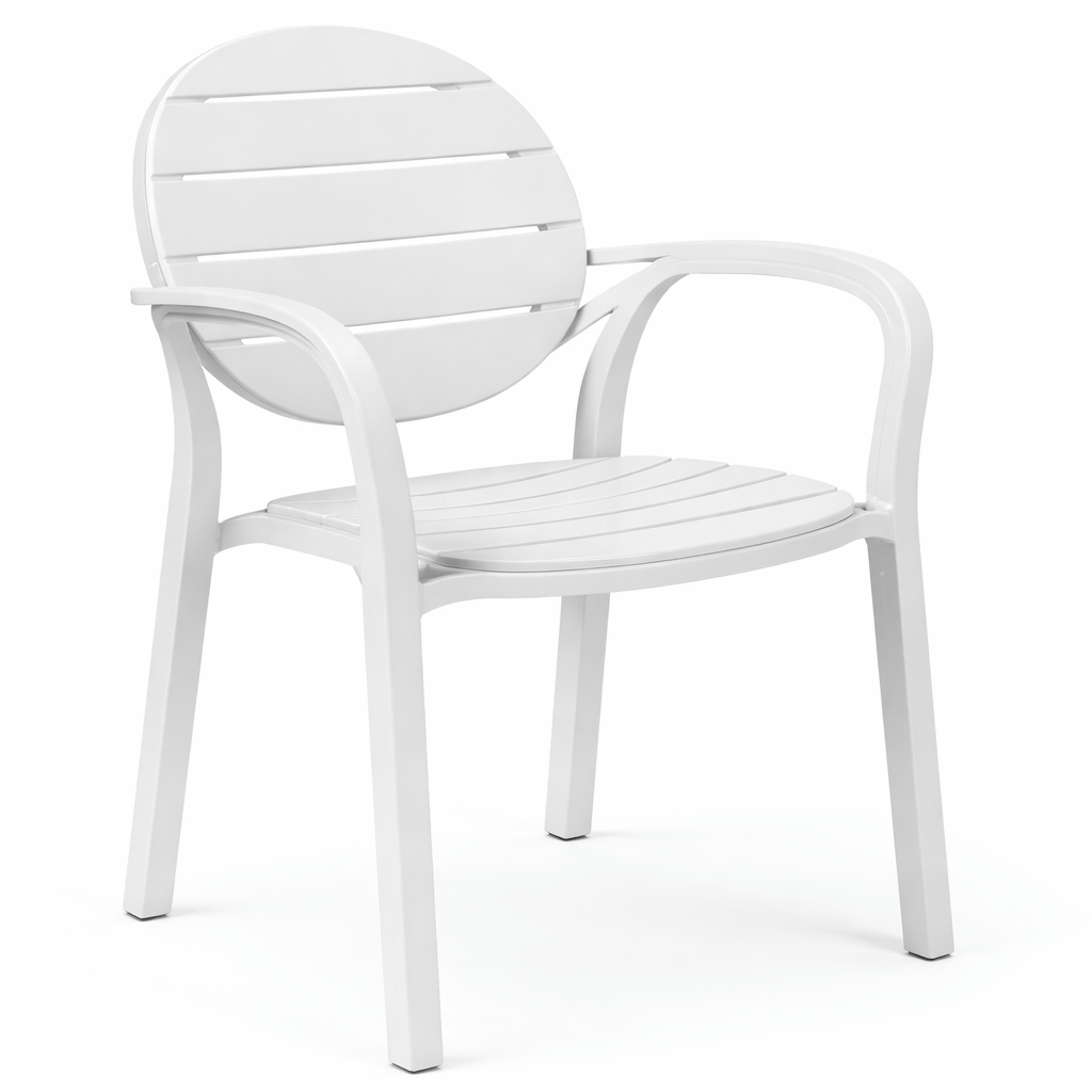 El sillón Palma de Nardi  es un sillón realizado en polipropileno , un material de alta calidad y resistente ideal para espacios al aire libre. Presenta una estructura tubular e incorpora tacos antideslizantes.