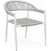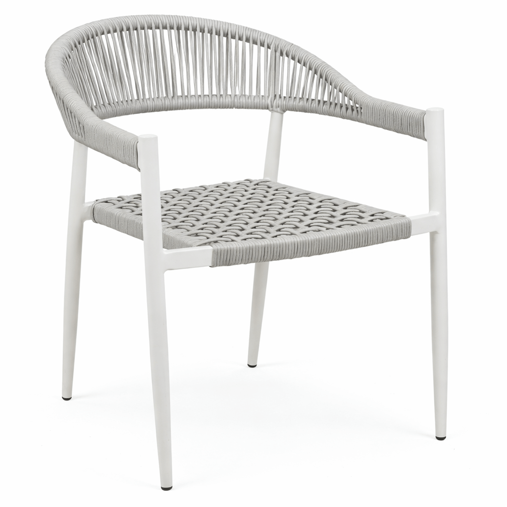 Sillón Zauri fabricado en aluminio pintado en color blanco, médula y cuerda trenzada gris.