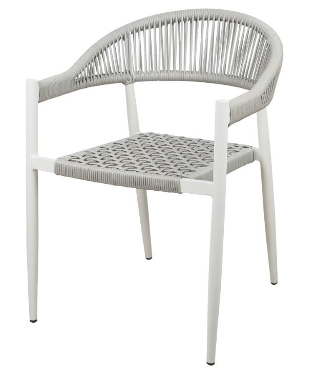Sillón Zauri fabricado en aluminio pintado en color blanco, médula y cuerda trenzada gris.