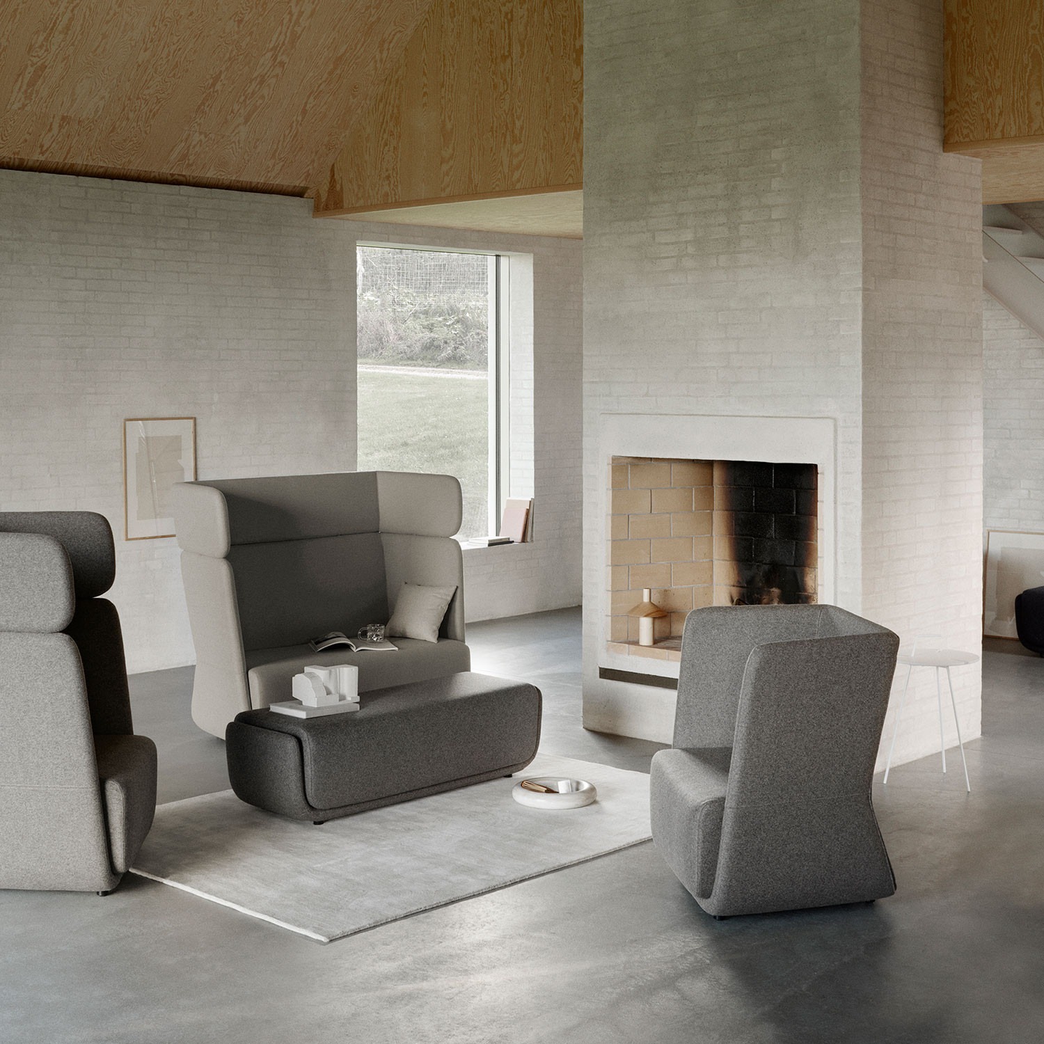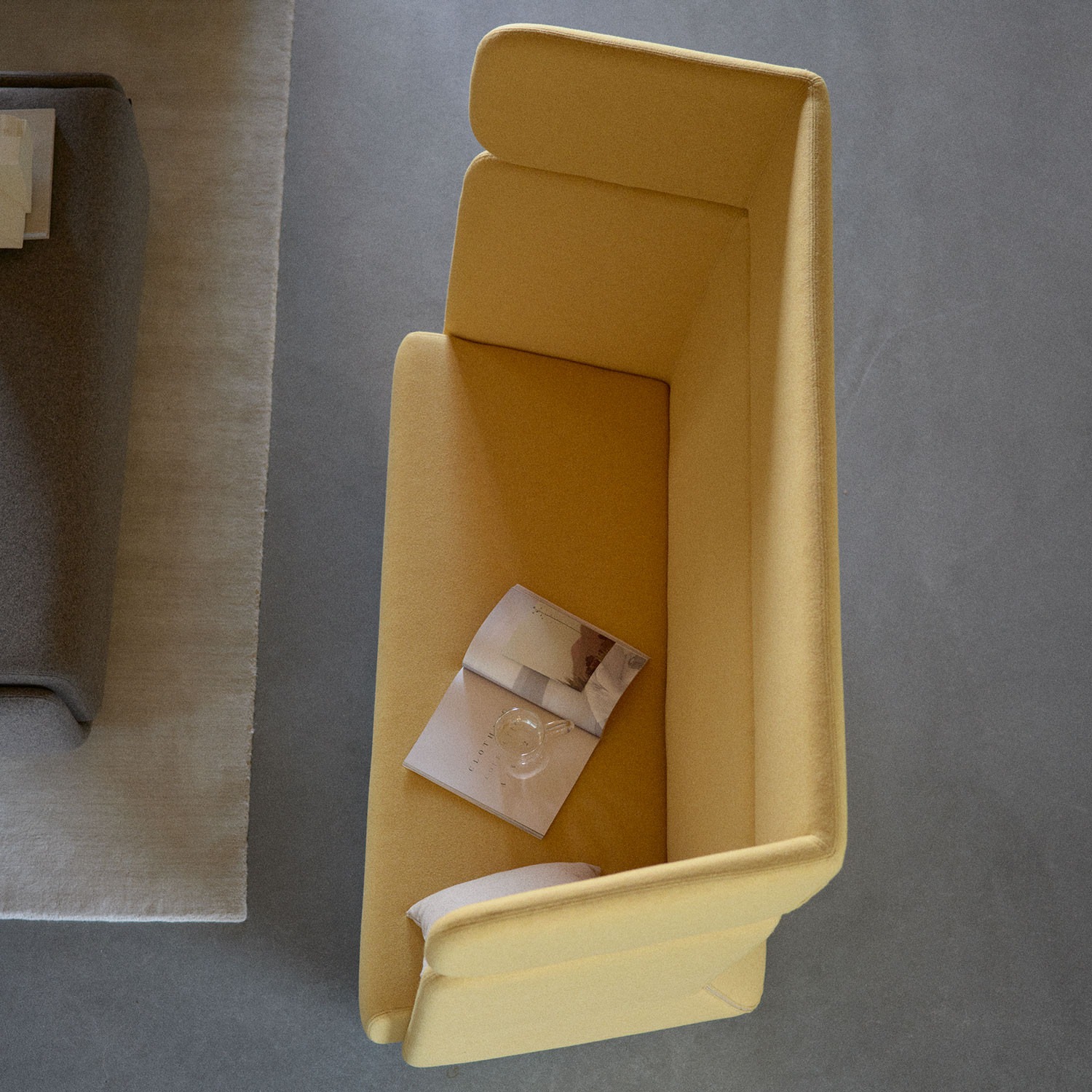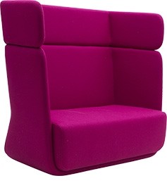 Sofá Basket de Softline, tapizado y con un respaldo envolvente extra alto que permite mayor privacidad.