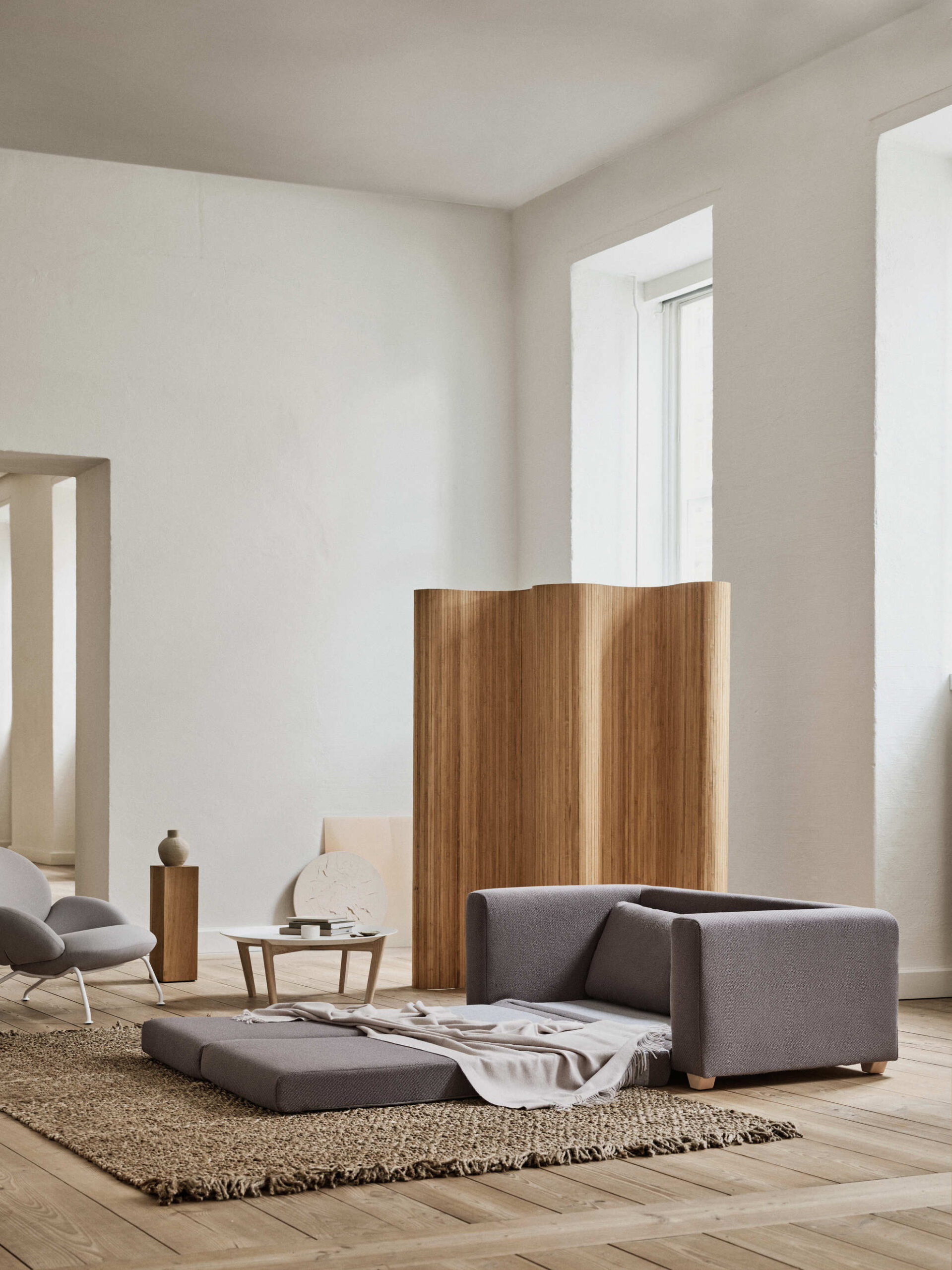 Sofá cama Victor de Softline, tapizado y con un estilo clásico.