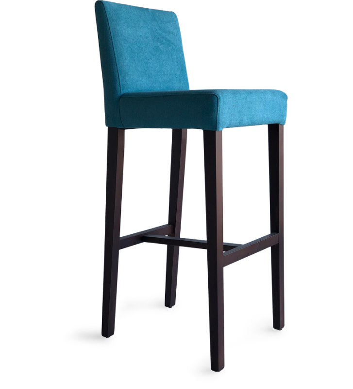 Taburete Alinas en madera de haya, asiento y respaldo tapizado, es ideal para bares y restaurantes que quieran dar un toque moderno y elegante.